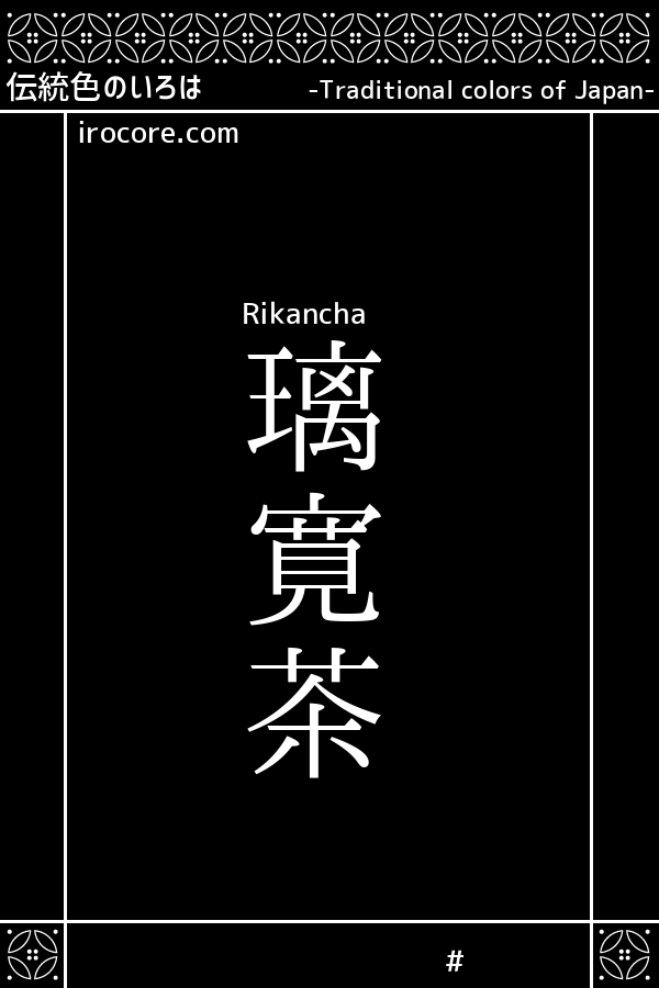 璃寛茶(りかんちゃ)とは、やや緑がかった黄みの暗い茶色のことで、媚茶 に藍みを加えた色になります。江戸後期の文化文政の頃、大坂で人気があった歌舞伎役者二世嵐吉三郎(俳名:瑠寛 )が好んで用いた色で、同じく人気のあった三世中村芝翫の芝翫茶 と共に人気を二分しました。