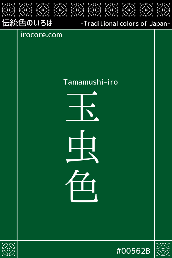 Tamamushi-iro refers to a dark, bluish green reminiscent of the wings of the jewel beetle (tamamushi). As its name suggests, the color derives from this insect, and it is considered equivalent to the colors known as Natsumushi-iro (夏虫色) and Mushi-ao (虫襖 / 虫青).